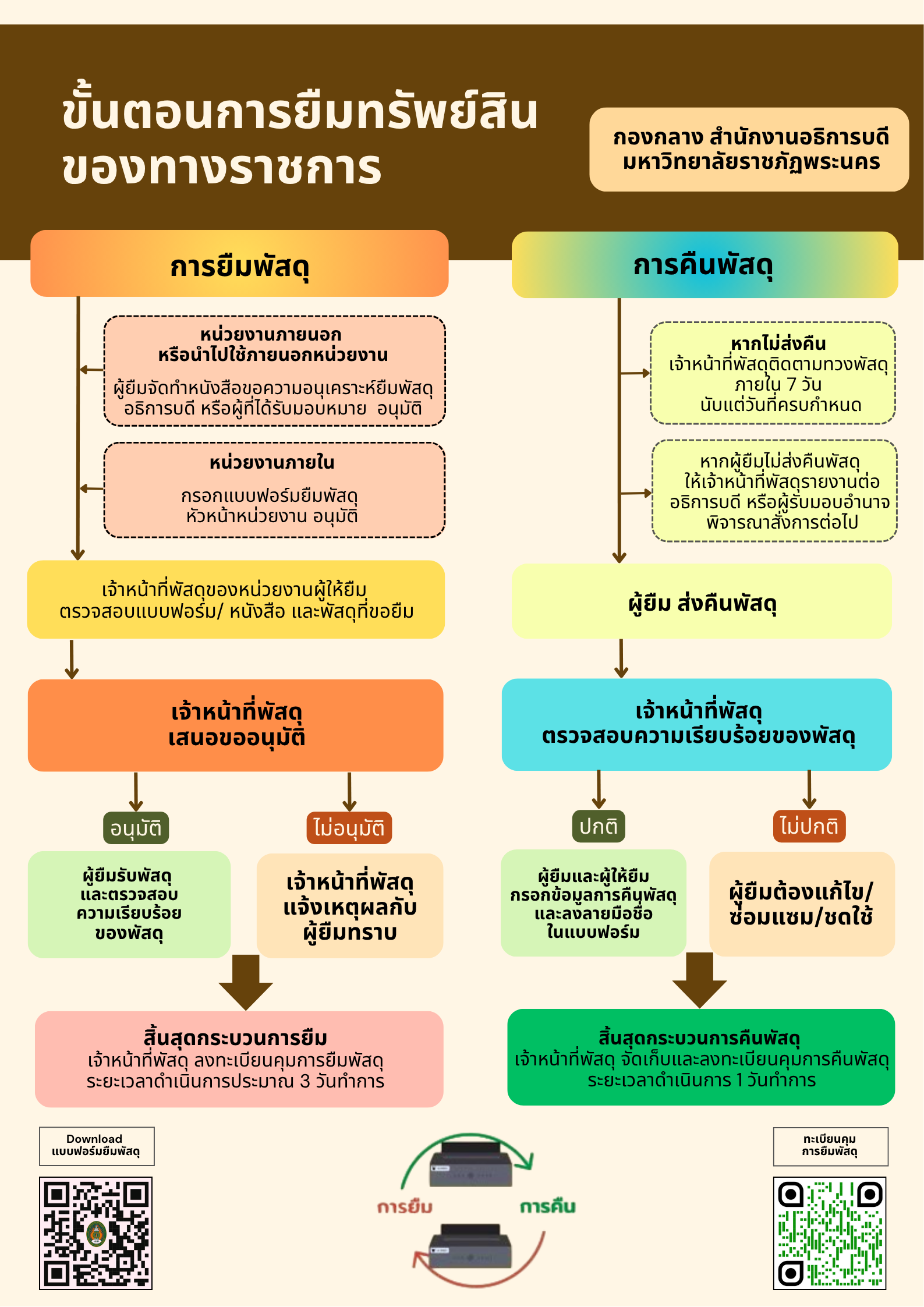 >> ประกาศ เรื่อง แนวปฏิบัติการยืมทรัพย์สินของมหาวิทยาลัยราชภัฏพระนคร >> แบบฟอร์มยืมพัสดุ >> ขั้นตอนการยืมพัสดุ >> ทะเบียนคุมทรัพย์สิน